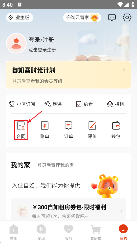 1、首先我们打开自如app,点击【我的】功能分区,往下拉在我的家这个分栏里面找到智能门锁,点击。