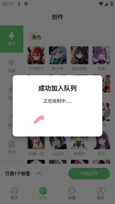 1、打开app,点击底部栏中的“创作”按钮。在左侧栏目中,用户可以选择角色、风格、动作和装扮等标签进行设置。