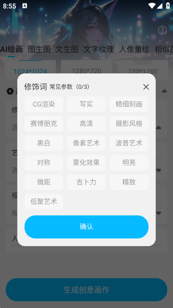 5、然后选择修饰词,艺术家等,选完后点击“生成创意画作”就可以得到AI生成的画作啦