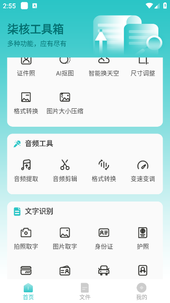 柒核工具箱app是一款功能十分强大的实用性软件,为用户提供了免费使用音频提取、音频剪辑、扫描、图片压缩、图片编辑、解压缩、文字识别、图片转文字、音频合并等功能,还能免费换话费,十分实用。不仅如此,软件还支持免费的证件照功能,只需要简单的操作一下,就可以轻轻松松得到一张完美的证件照,给用户提供了更加便捷的服务内容。而且软件内存小,操作简单,精巧的设计感不用担心损耗太多手机内存消耗,支持多格式的自由切换和自定义设置调整。各项功能都能免费获取使用,有需要的朋友快来下载体验吧。