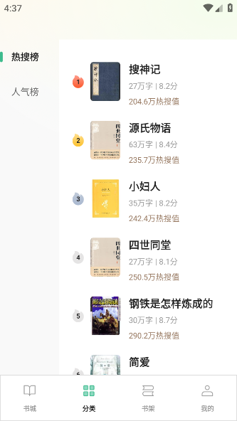 2、进入首页,“书城”以及“分类”页面有很多的小说资源,包含了言情、科幻以及武侠等类型。