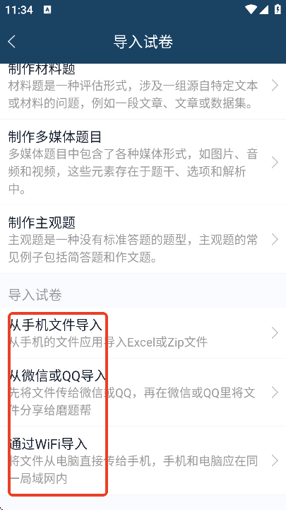 点击左上角菜单按钮,选择“USB”或直接点击“导入试卷”按钮。