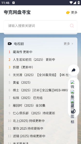 除了传统的网盘文件搜索,夸克网盘寻宝还特别加强了短剧和影视资源的搜索功能。用户可以通过输入关键字,快速找到最新的影视资源和短剧,满足不同用户的娱乐需求。无论是热播剧集、经典电影,还是短小精悍的网络剧,夸克网盘寻宝都能帮你一网打尽。