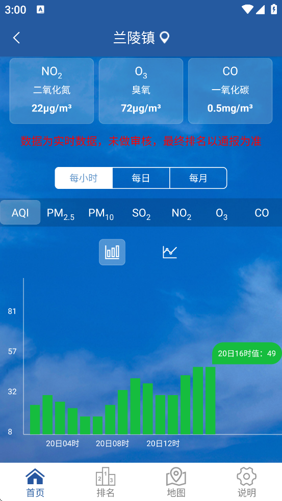 排名展示:支持全国、全省及临沂市各区县、乡镇的空气质量排名查询。
