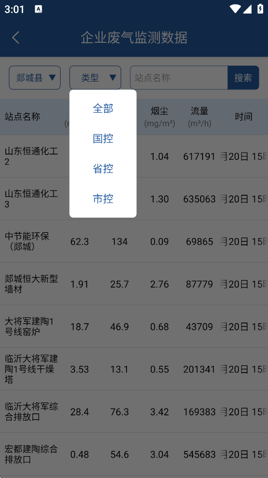 实时监测:可查看全市范围内各监测点的PM2.5、PM10、温度、湿度等实时数据,支持按国控、省控、市控等站点分类筛选。