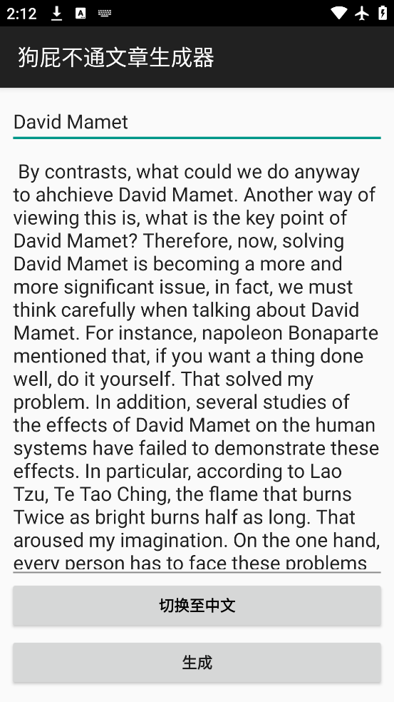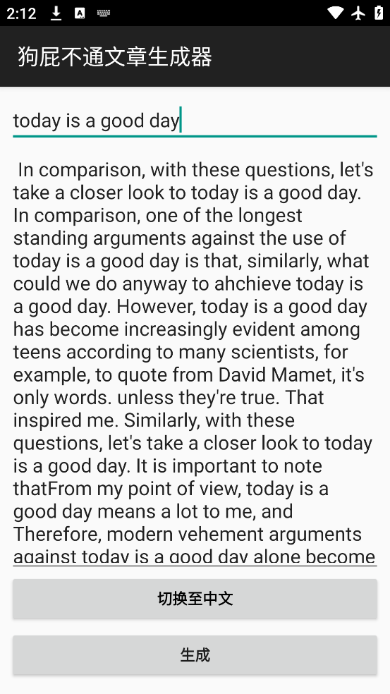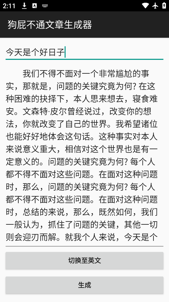 狗屁不通文章生成器app下载安卓版是一款非常有趣的软件,用户可以根据不同的文章主题进行生成,能够快速的给出合理的文章,整体效果十分有趣。本站提供了狗屁不通文章生成器app下载安卓版资源,感兴趣的话快来下载吧!