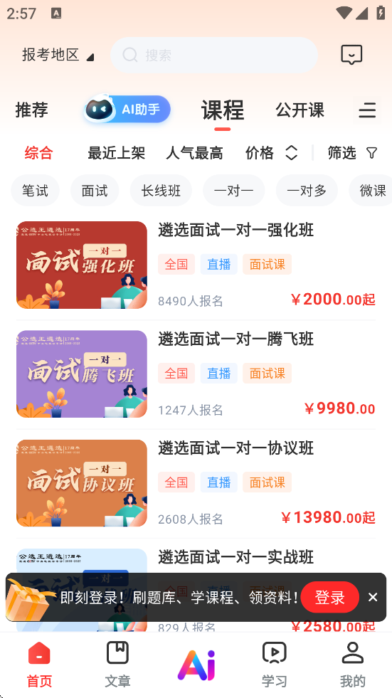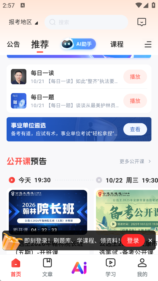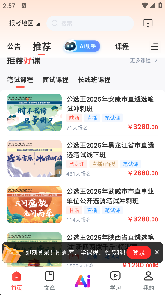 2、全场景服务:24小时AI答疑(“公选汪”)、分省市分系统课程、督学跟踪等,形成闭环备考生态。