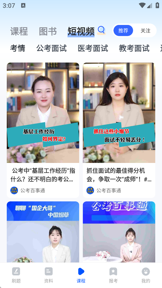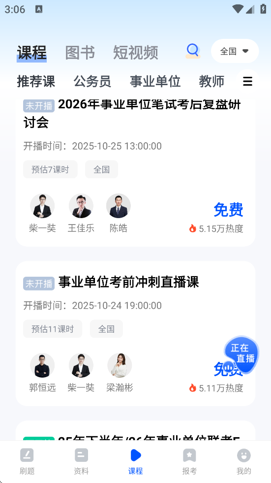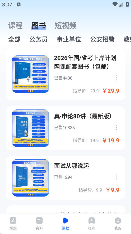 课程学习:选择公务员、事业单位等考试类目,浏览5000+门直播/录播课程,支持打点学习、下载讲义及加入答疑群。