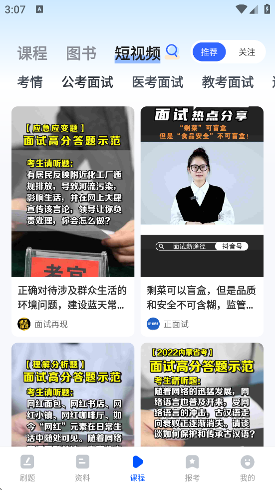 3、互动服务:直播课支持实时提问、表情互动及答题练习,面试云可录制答题内容并生成文本复盘。