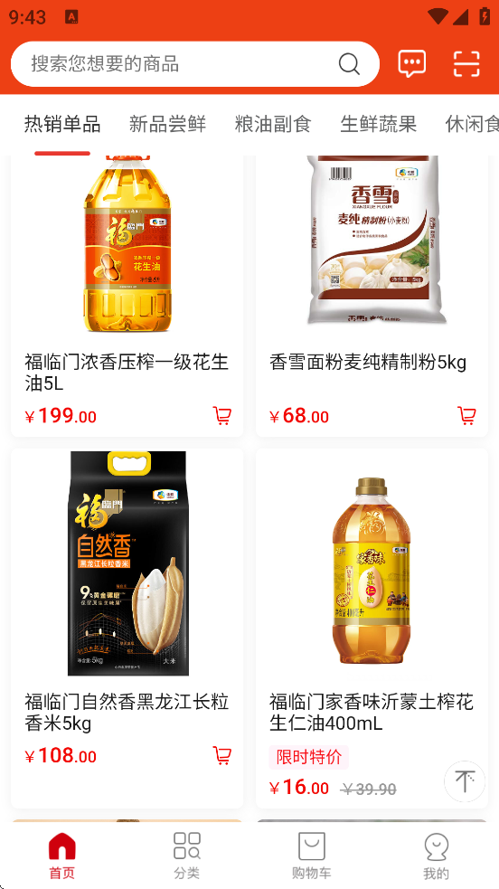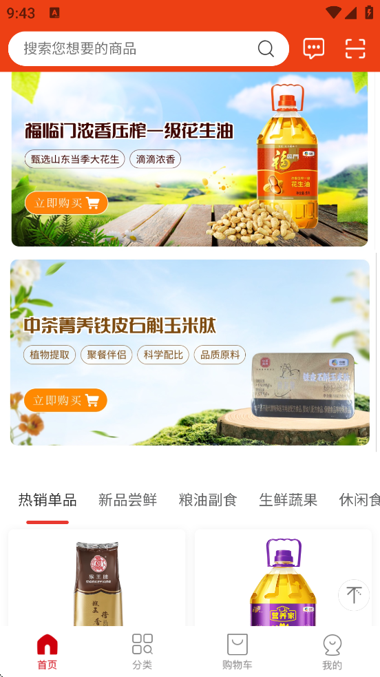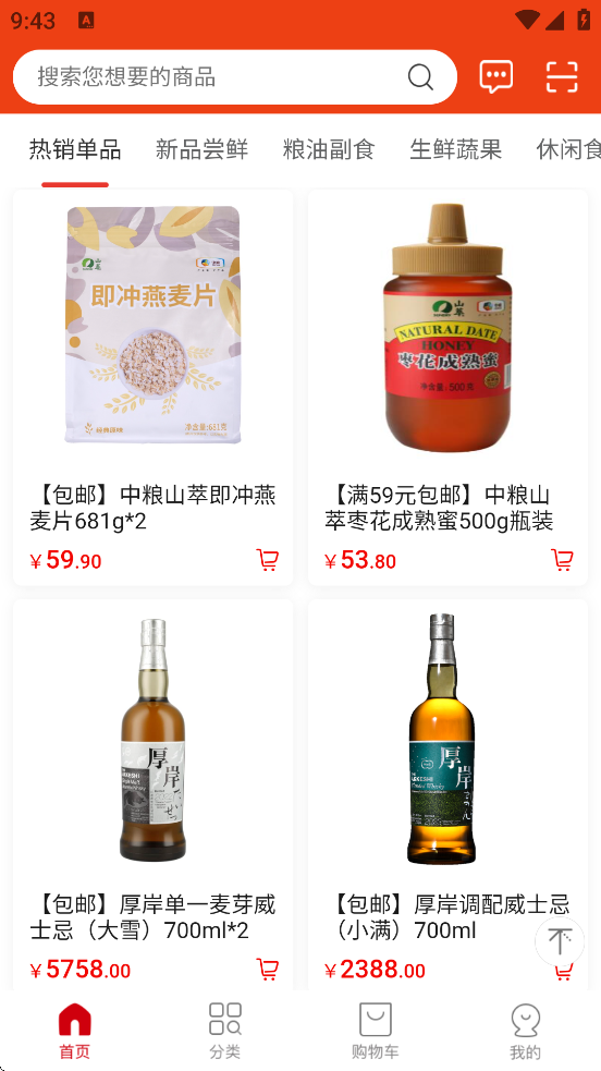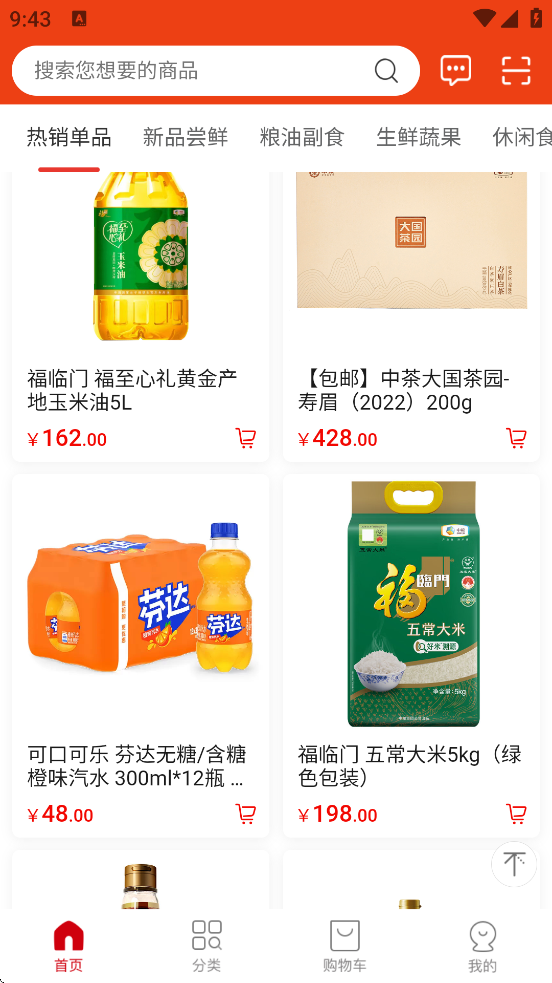 打开APP后,通过首页分类或搜索栏查找目标商品(如休闲零食、生鲜粮油等),点击商品进入详情页查看规格、价格等信息。