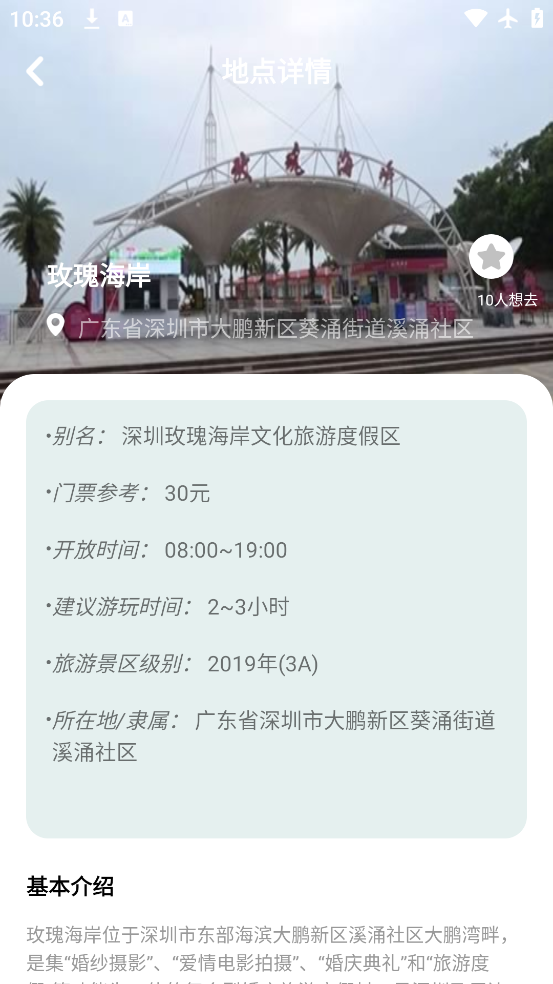 3、可以根据定位功能权限找到附近的露营基地,了解营地的基本信息、门票信息以及游玩时间。