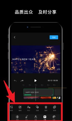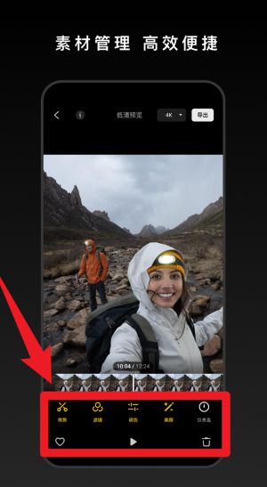 剪辑工具:在时间线拖动选择片段(如10-15秒),点击对号确认修剪,支持滤镜、字幕、D-Log M调色等专业功能。