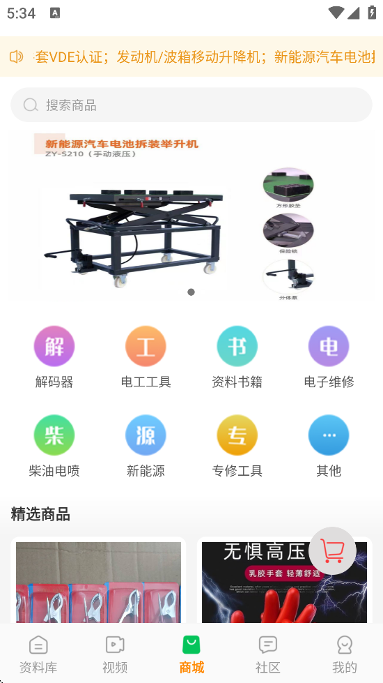 4、商城服务:提供汽修工具(如诊断仪、举升机)及安全配件(高压电防护手套)。