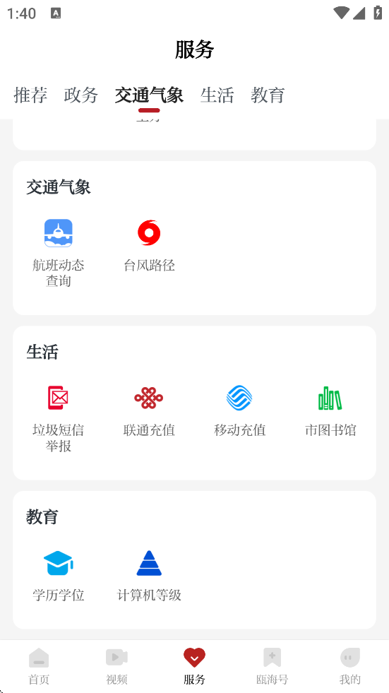 2、政务服务:集成交通违法查询、台风信息、政务办事等便民服务。