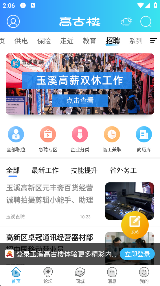 发帖/发布信息:点击首页“+”号,选择分类(如“求职”“二手”),输入内容后发布。