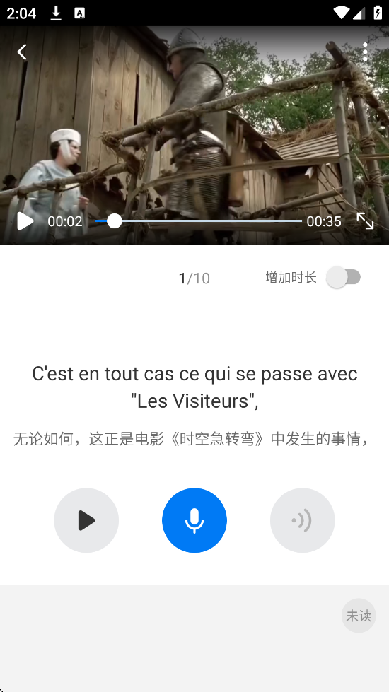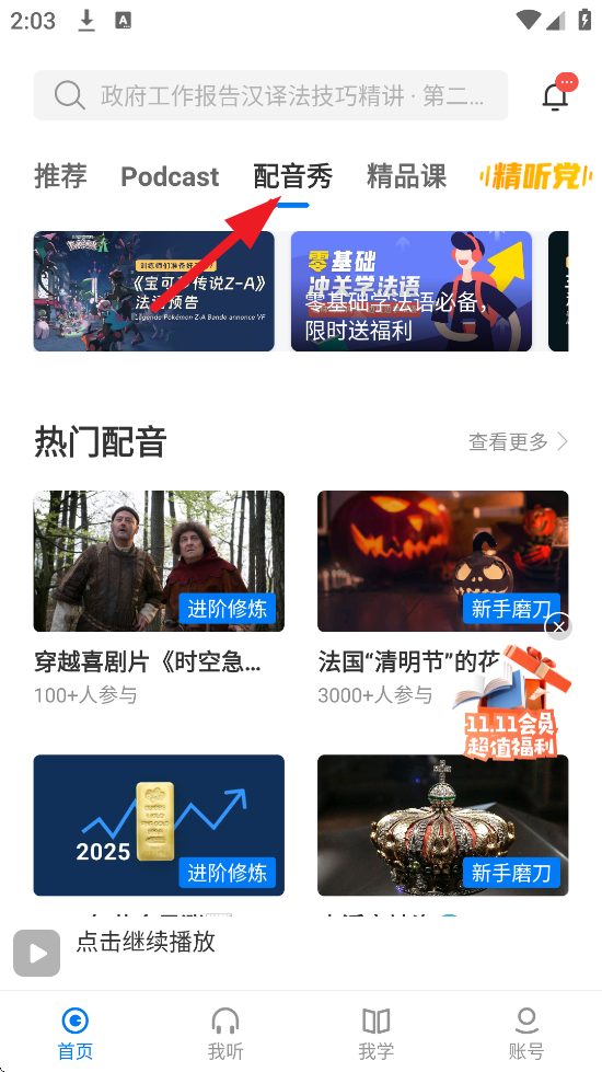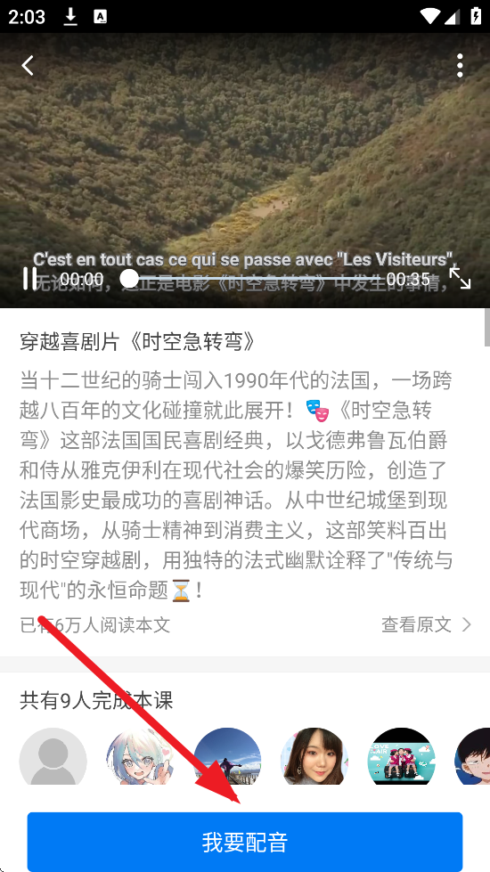 点击“我要配音”逐句录制,系统支持与原声对比发音,并通过跟读打分功能纠正发音问题。