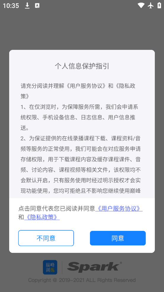 1、下载安装完成后进入,需在用户协议和隐私政策界面点击同意,接受相关条款后才能进入应用。