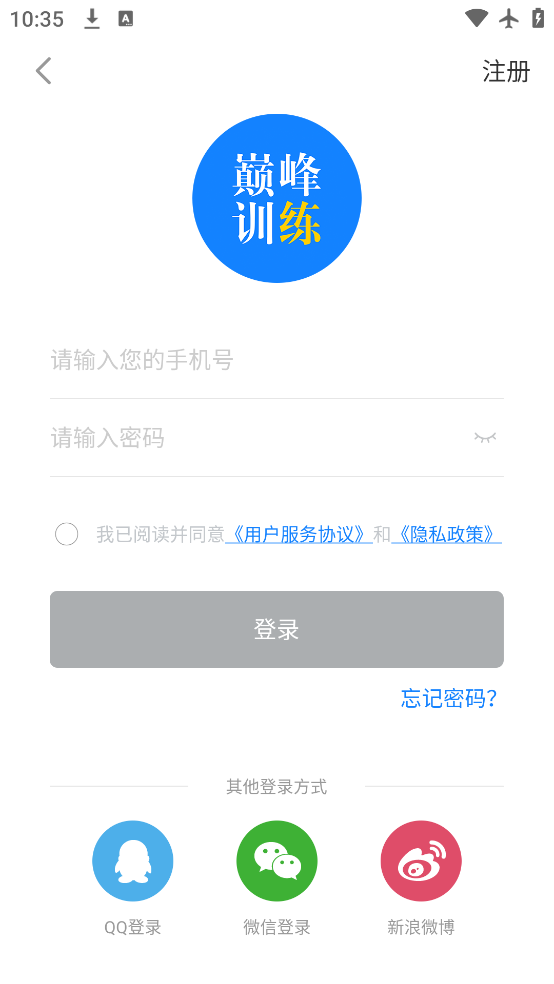 3、在登录界面,需输入手机号和密码,勾选同意用户服务协议和隐私政策后,可点击登录完成注册登录,也可选择QQ、微信、新浪微博等其他登录方式。