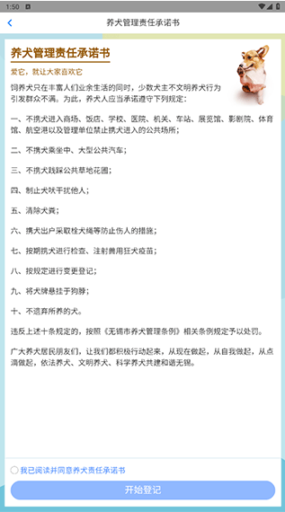 3、签订“养犬管理责任承诺书”,然后点击“开始登记”。