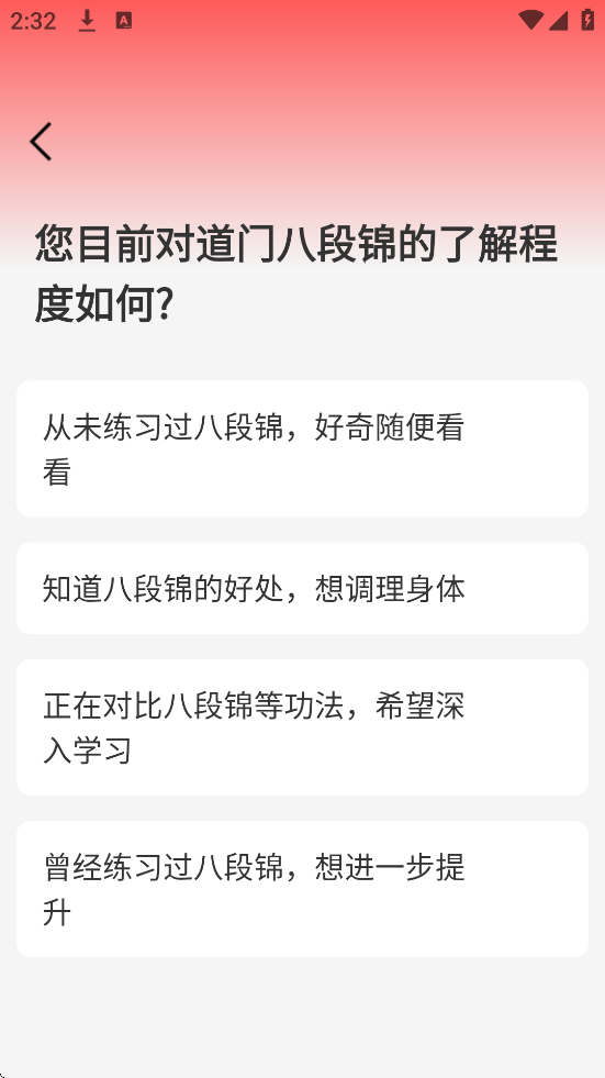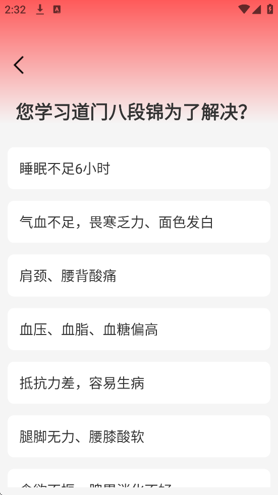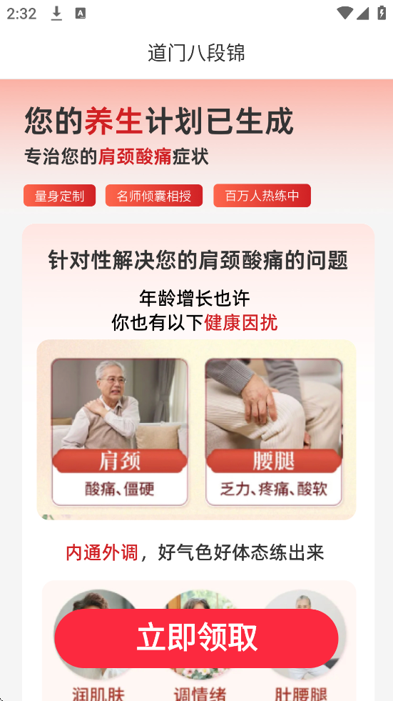 1、个性化养生方案定制:首次使用时,根据提示输入你的年龄、体质和健康目标(如缓解疲劳、增强免疫力等),系统将生成专属的八段锦练习计划。