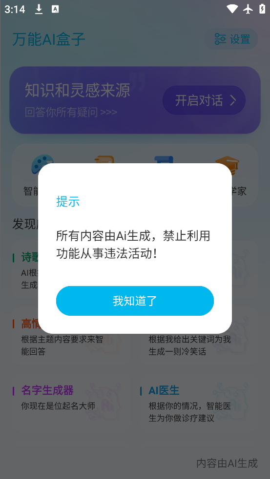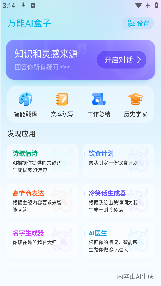 万能AI盒子是一款利用先进的人工智能技术,实现AI聊天、创作以及成为您生活的帮手和工作的工具;提升工作效率、解惑生活百科、知识技能,同时AI强大的学习理解能力,丰富的数据支撑,让人工智能为你所用!