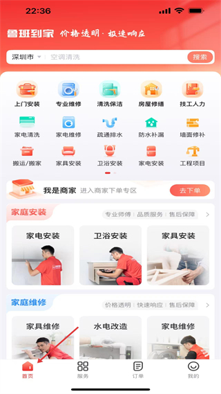 1、首页深圳功能入口含上门安装、专业维修等,服务涵盖家电清洗、家具安装等,还有家庭安装、维修板块,可找师傅上门。