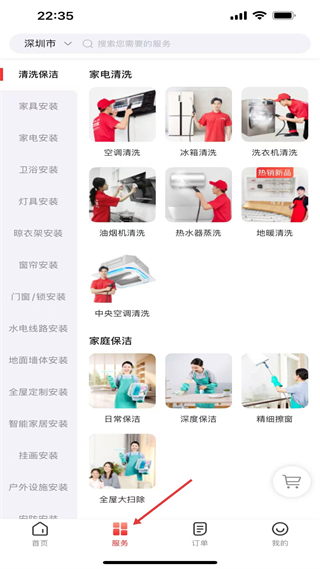 2、服务页深圳,清洗保洁板块含空调清洗、家庭保洁等,家电清洗有冰箱、洗衣机清洗等,分类清晰选服务。