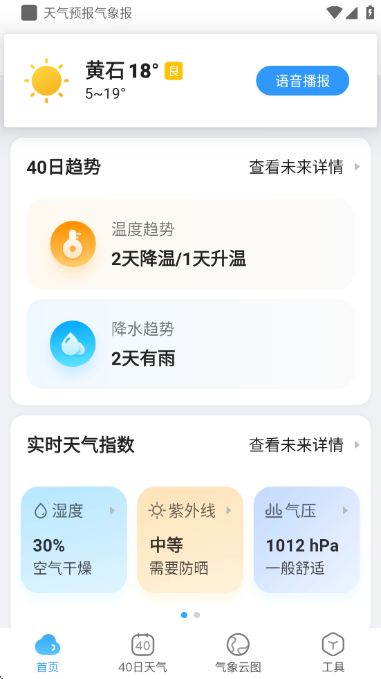 天气预报气象报正版下载安装是一款天气预报软件,软件内为用户提供便捷天气服务,用户可以通过软件查看最新天气预报情况,同时软件内为用户提供每日生活建议,如此好用的软件,你还等什么?感兴趣的小伙伴快快下载前来体验吧!