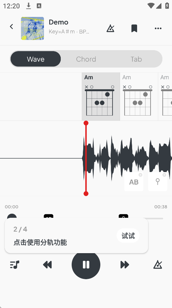 2、分析和弦:在音频播放界面,点击“分析和弦”按钮,软件将自动识别歌曲中的和弦走向。