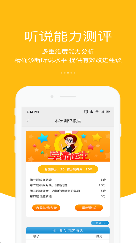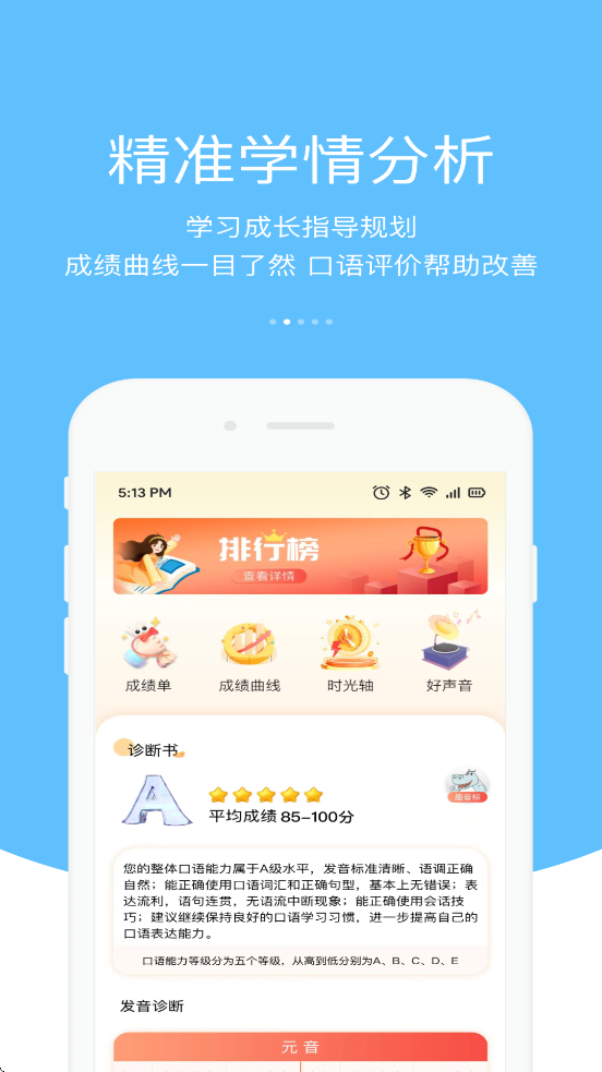 3、多维度能力分析:通过成绩曲线、口语评价等数据,精准诊断听说水平。