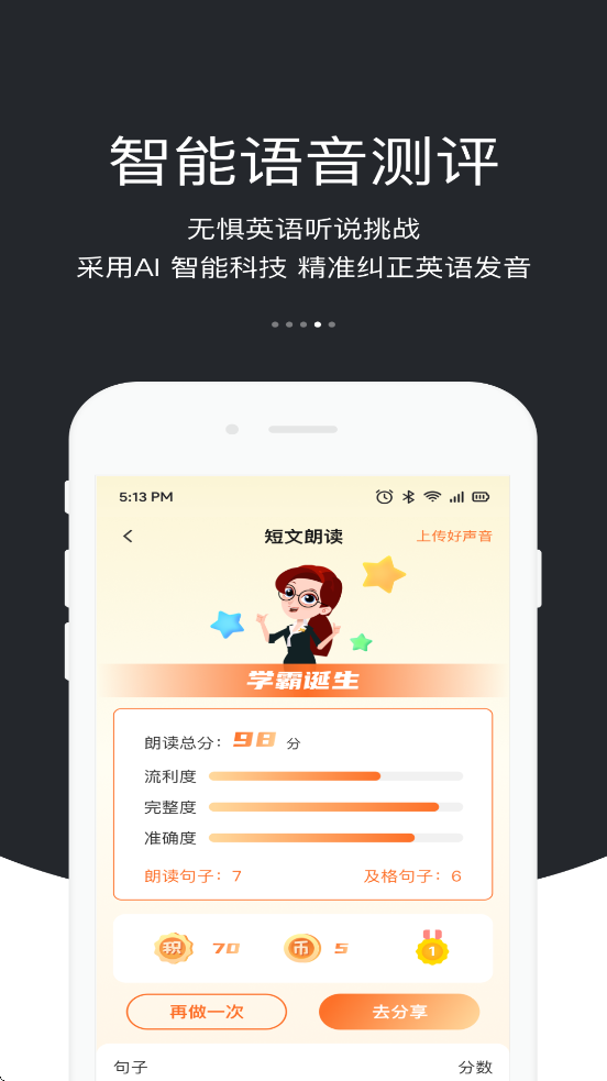 1、智能语音测评:实时检测发音准确性,提供纠正建议,支持中高考口语模拟测试。