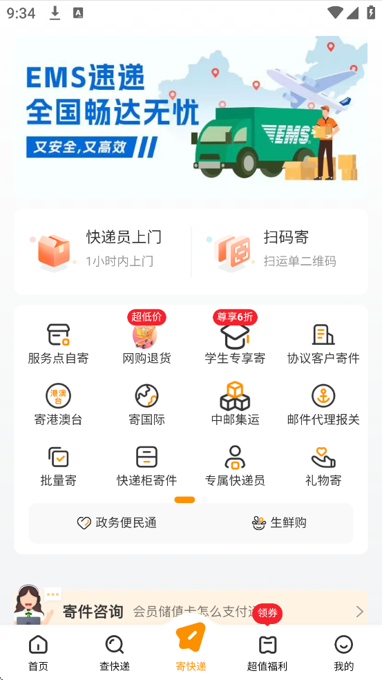3、智能寄件:电子运单+扫码寄件,无需手写面单,生成二维码即可完成寄件。