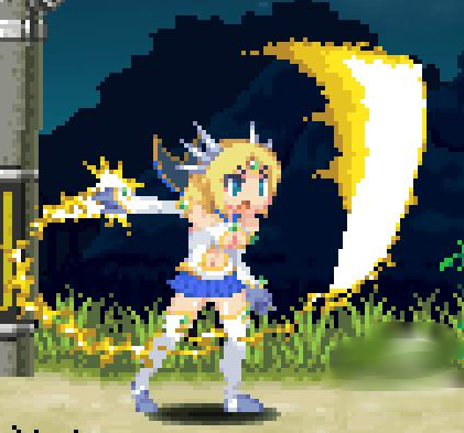 4.下蹲攻击则为钩脚(类似古烈的踢技),算是她为数不多的对空手段,能对付如羽毛哈比或陨石等敌人,使地面的小型怪物浮空。但由于整体对空能力欠佳,此招实用性有限,不过可以衔接空中下A攻击。
