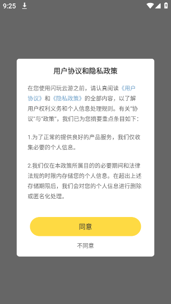 1、首先在橘子下载安装好闪玩云游app,查看并同意隐私政策与用户协议。