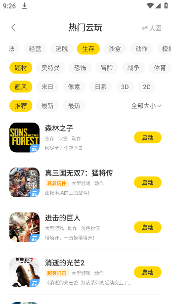 4、点击“更多”,可以看到很多云游戏分类,包括经营、逃脱以及沙盒等类型。