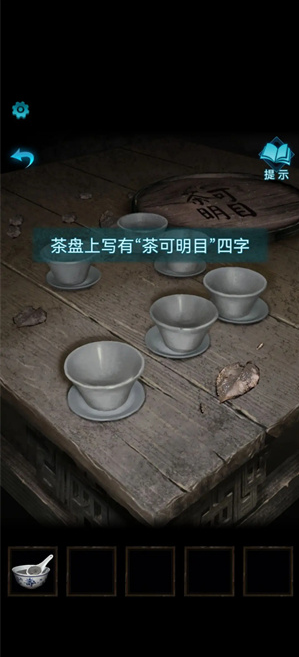 8、调查木桌发现上面写着茶可明目,现在虽然没有茶叶但是手边有现成的香灰就凑合一下吧。