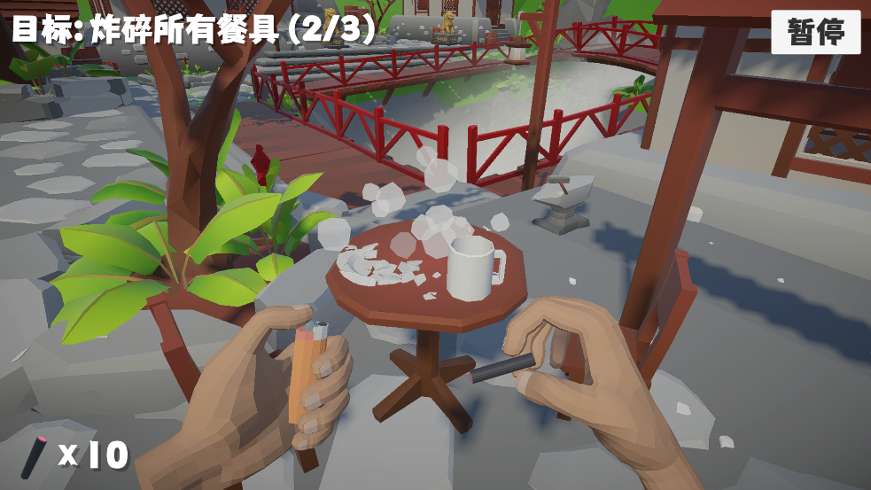 3、过关后,就能挑战下一关,这一关需要将餐具全部炸碎,玩家需要使用左手的打火机将右手的鞭炮点燃,再扔出去。
