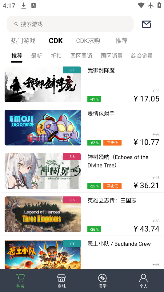 3、在购买这栏,有热门游戏、代购、cdkey、充值等,有各种热门游戏、游戏激活码等资源购买。