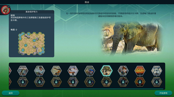 4、探险家:普通游戏开始时场上有探险家,必须拥有至少5种动物类目图标和5种大洲图标才能获胜。困难不再拥有探险家,且依然必须拥有至少5种动物类目图标和5种大洲图标才能获胜。这个挑战比较麻烦的地方是凑图标,在开局留牌时就需要考虑图标的情况,尽量多地保留可控的图标,大洲图标可以通过合作动物园获取,动物类目图标是7选5,可以考虑通过萌宠图标和熊图标来降低收集难度。基础保护项目中如果有5大洲或5类目的任务,那么在凑图标时可以顺便完成,一般AI也不会刻意攒着去抢5盾的,往往3类或者4类就会去做。当然,和挑战1一样,只要你不完成目标,就不能宣告游戏结束,所以大可以不必为了凑图标而降速,只要凑图标的速度超过AI的跑分速度就可以。推荐使用地图好莱坞山、研究机构。