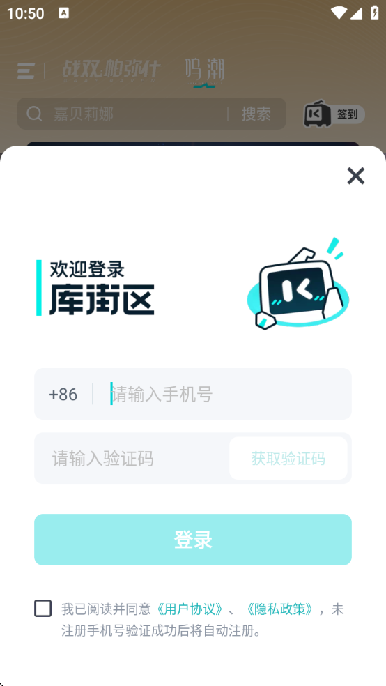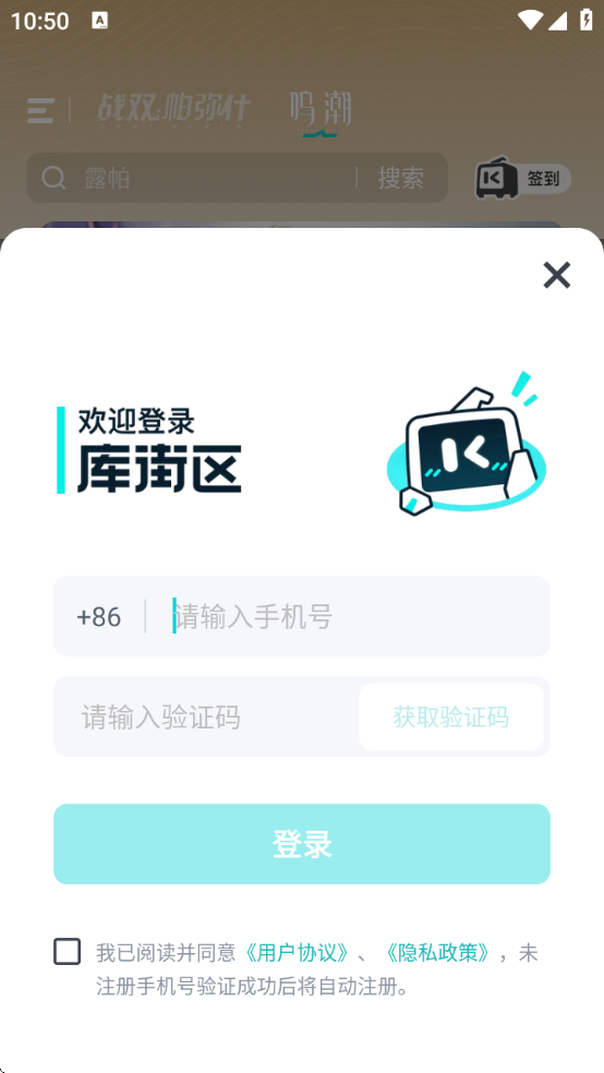 1、打开库街区app,首先登录账号,新用户手机号验证码即可注册登录;