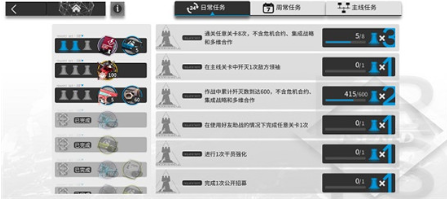 任务系统共有三个部分:见习任务、日常任务、周常任务和主线任务。其中日常任务将在每日凌晨4点重置,周常任务将在每周一凌晨4点重置。玩家可以通过完成诸如击杀特定数量的敌人、三星评价通关副本、强化干员等各项任务目标来获取任务印章,从而领取日常/周常任务内的龙门币、作战记录、素材等奖励。而对于见习/主线任务而言,玩家需要完成诸如攻略特定关卡或是制造特定材料的任务以获取奖励或解锁下一阶段的任务;