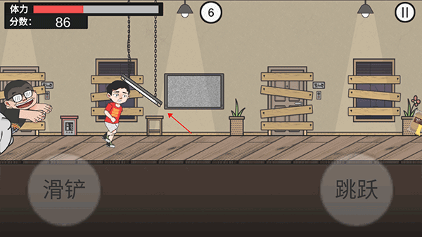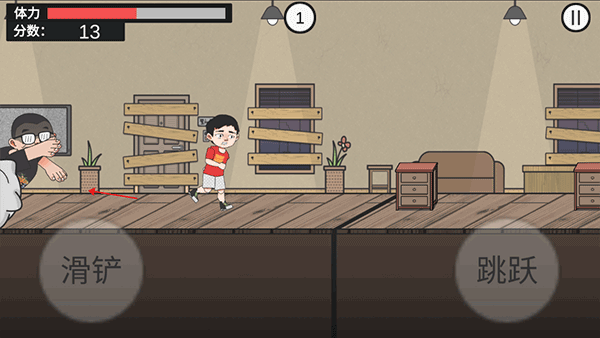 4、点击开始即可开始游戏,左边是滑铲右边是跳跃,玩家需要操控人物躲避杰哥。
