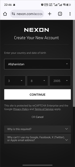2、选择登录方式,游戏支持谷歌登录,登录后注册绑定NEXON账号,并选择地区和出生年月日。