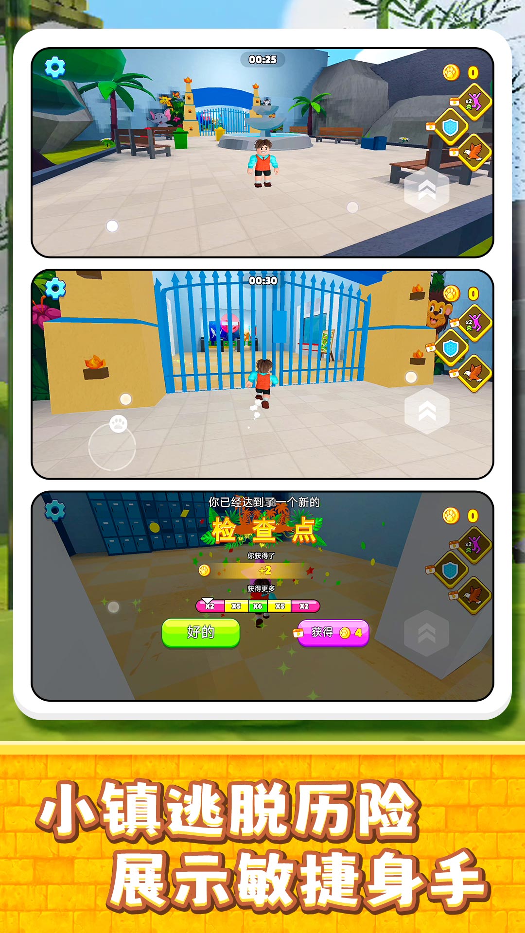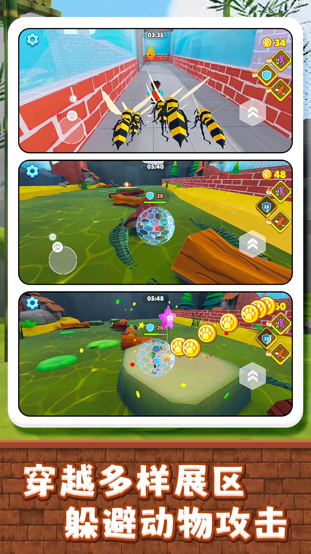 4、单人模式挑战关卡,躲动物、破机关,冲过检查点,解锁新展区、拿奖励。