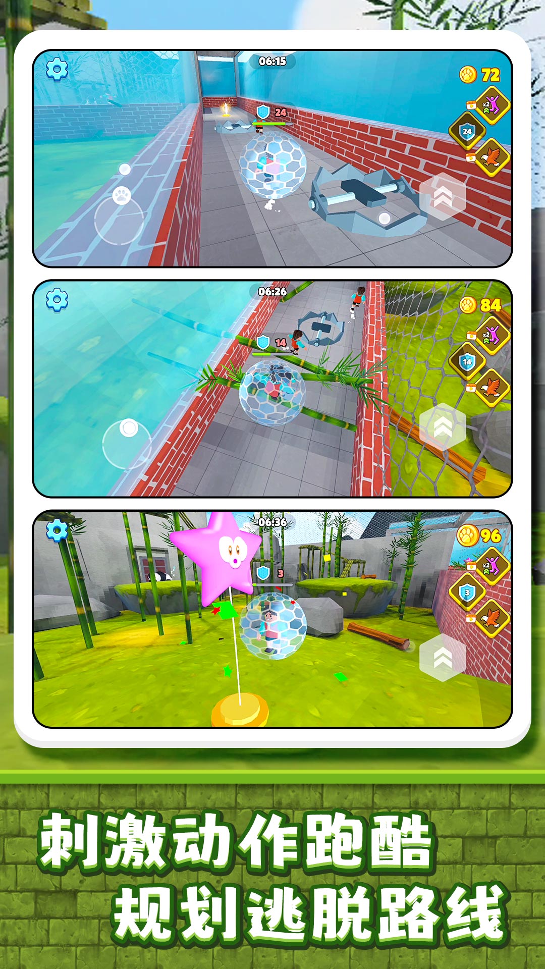 2、道具策略运用:收集场景中的特殊道具获得临时能力。无敌星星可突破重围,加速鞋能甩开追兵,需把握最佳使用时机。