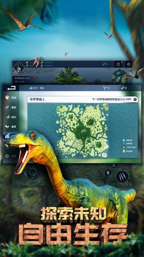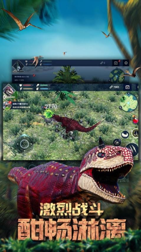 4、生存与战斗:需管理饥饿度、健康值,与其他恐龙争夺领地或合作。