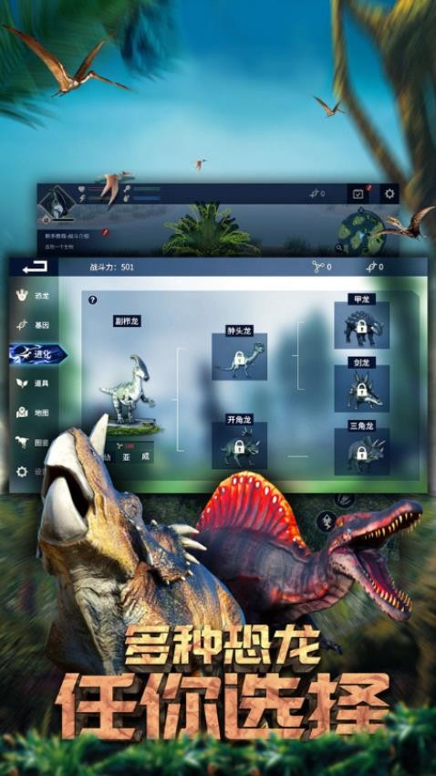2、复杂进化系统:通过战斗、任务解锁进化分支(如剑龙、披甲龙),提升属性与技能。