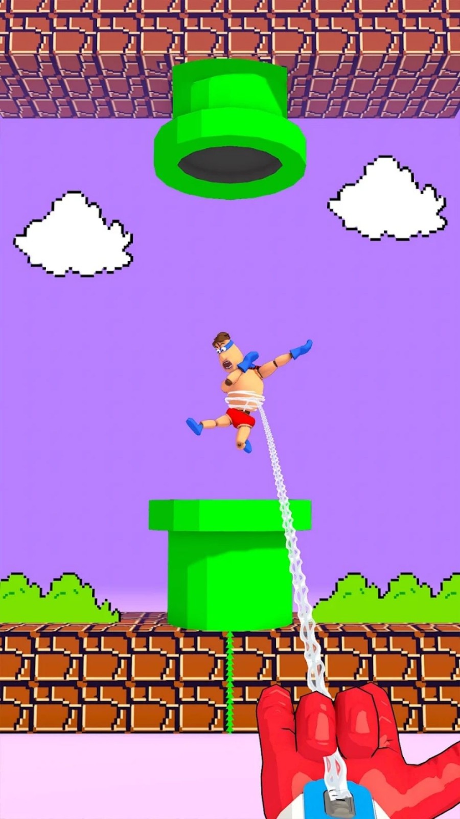 1、滑动屏幕瞄准英雄,发射蛛丝黏住目标后拖拽撞击障碍物。