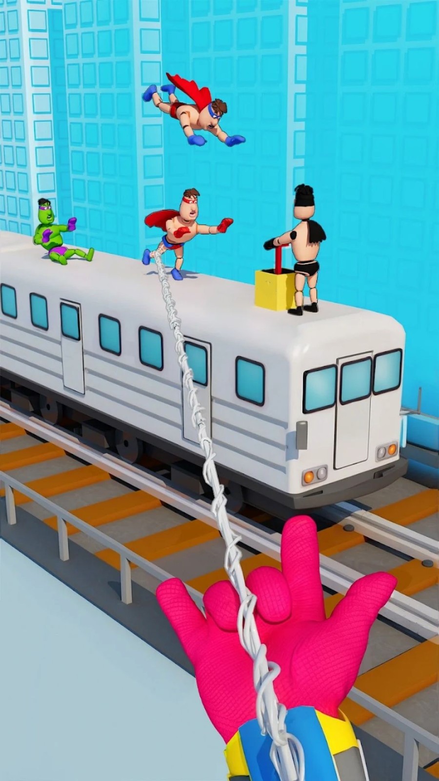 4、利用蛛丝投掷、拉扯触发英雄肢体分离、场景破碎效果,实时物理反馈增强破坏爽感。