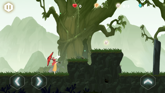 第二关:类似于跑酷游戏,索菲利亚会撑着她的小红伞一直向前飞行,需要通过上下按键来操作二段跳和缩小技能,注意不要撞到台阶。尽量多收集宝石和月光石,把握好跳跃的时机。
